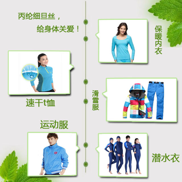 由于丙綸細旦絲的比表面積大 ,織物單纖維之間間隙小 ,使得高密織物具有防水透濕功能,因此它也被制成 :滑雪服 、登山服 、潛水服等各種運動服。